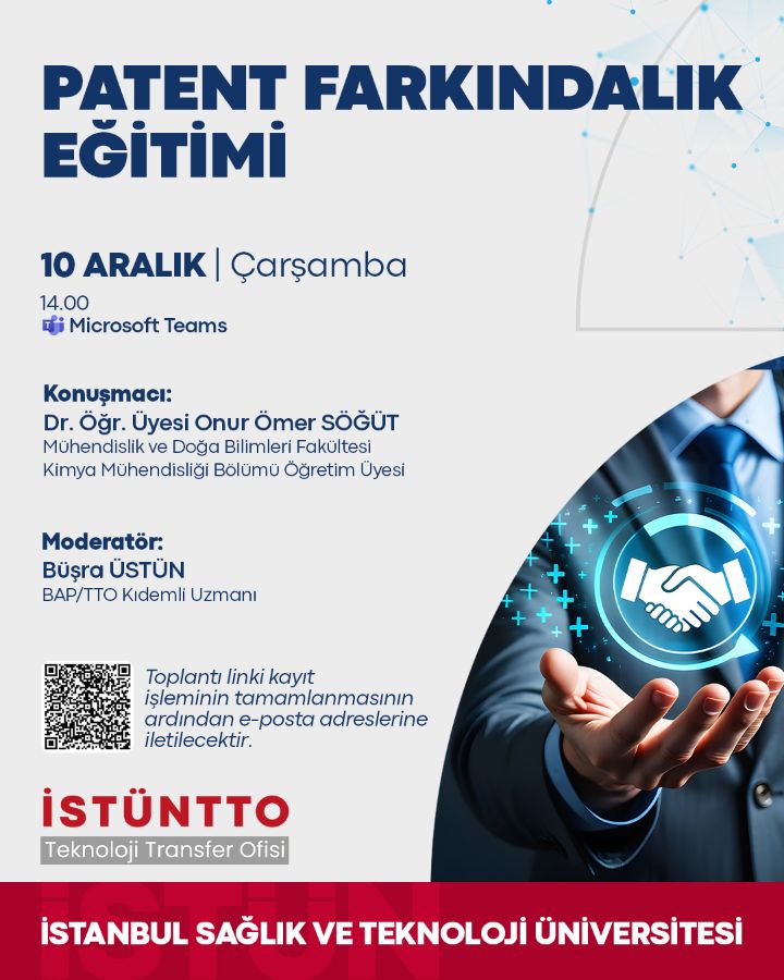 Patent Farkındalık Eğitimi etkinliği kapsamında toplantı linki kayıt işleminin tamamlanmasının ardından e-posta adreslerine iletilecektir. Kayıt linkine ulaşmak için tıklayınız.